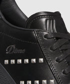 Low top sneakers. Smooth leather upper. Studded stripe motifs on the side panels. Stamped logo on the back of the collar. Front lacing. Rubber midsole. Rubber outsole.