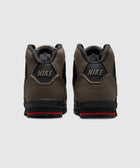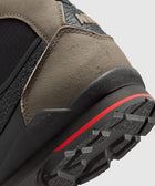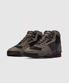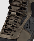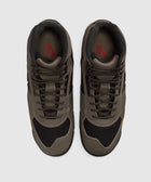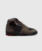 High top sneakers. Nubuck and mesh upper. Nubuck overlays around the eyelet panels, and heel counter. Front lacing. Padded nubuck tongue with an embroidered logo at the center. Synthetic TPU logo motif patches on the side panels. Composite foam midsole. Low profile rubber outsole.