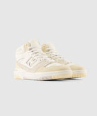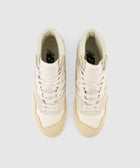 High top sneakers. Leather upper. Leather overlays around the toe, side panels, upper eyelet panels, and heel counter. Front lacing. Nylon tongue. Leather logo inserts stitched on the side panels. Stamped logo on the outer collar. Padded nylon mesh collar. Rubber midsole. Rubber outsole.