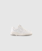 Low top sneakers. Leather upper. Leather overlay around the toe. Leather side panels, and heel counter. Cutout Leather logos on the side panels. Front lacing. Nylon mesh tongue, and collar. Stamped logo on the heel. Rubber midsole. Rubber outsole.