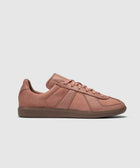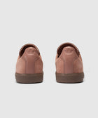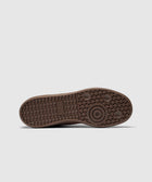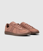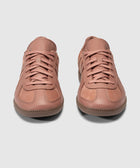 Low top sneakers. Leather upper. Suede overlays around the toe, eyelet panels, side panels, and back of collar. Front lacing. Leather tongue. Suede patch stitched on the tongue with a stamped logo motif. Rubber midsole. Rubber outsole.