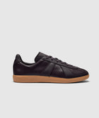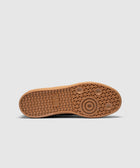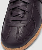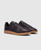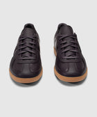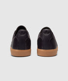 Low top sneakers. Leather upper. Suede overlays around the toe, eyelet panels, side panels, and back of collar. Front lacing. Leather tongue. Suede patch stitched on the tongue with a stamped logo motif. Rubber midsole. Rubber outsole.