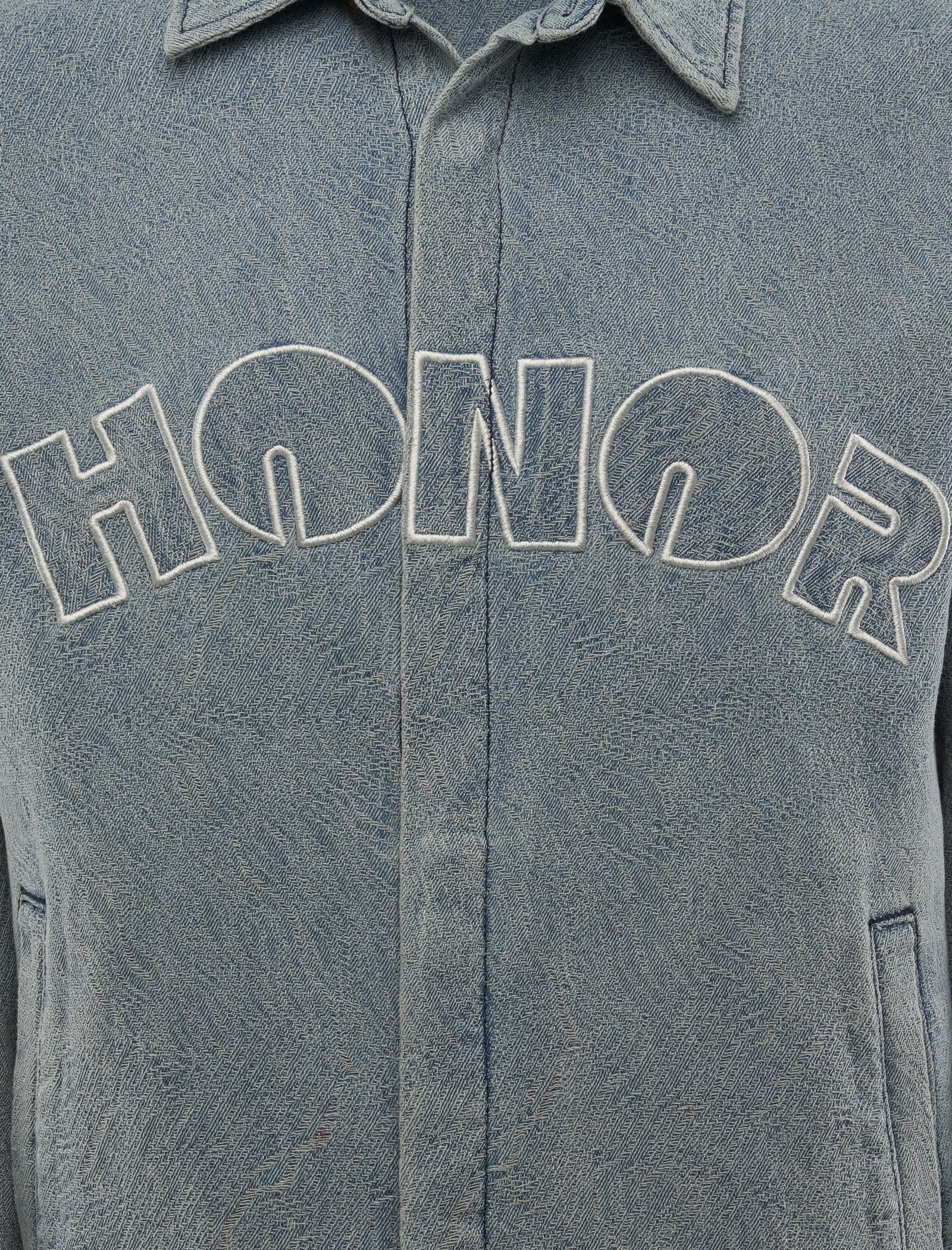 Relaxed-fit coaches shirt jacket. Pointed collar. Embroidered logo text at chest. Two-pockets at sides. Barrel cuffs. Button closure at center front.