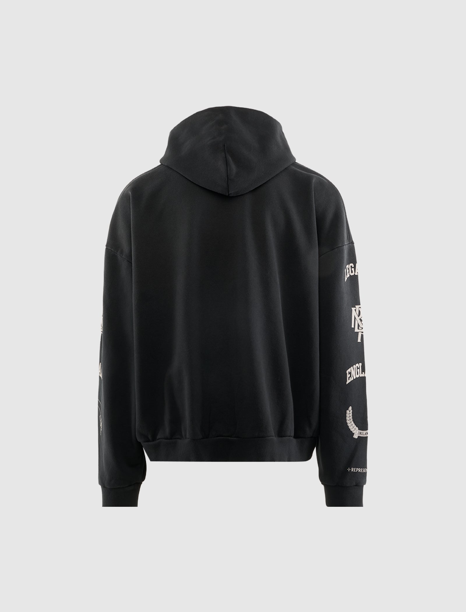 Oversized-fit pullover hoodie. Fixed hood. Graphic logo texts and prints at front and sleeves. Kangaroo pocket at front. Ribbed cuffs and hem.