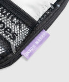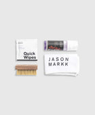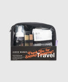 Travel shoe cleaning kit. Includes Premium shoe cleaner, a premium shoe cleaning brush, a premium microfiber towel, and quick wipes. Packaged in a ripstop nylon case with a zippered closure and a clear front.
